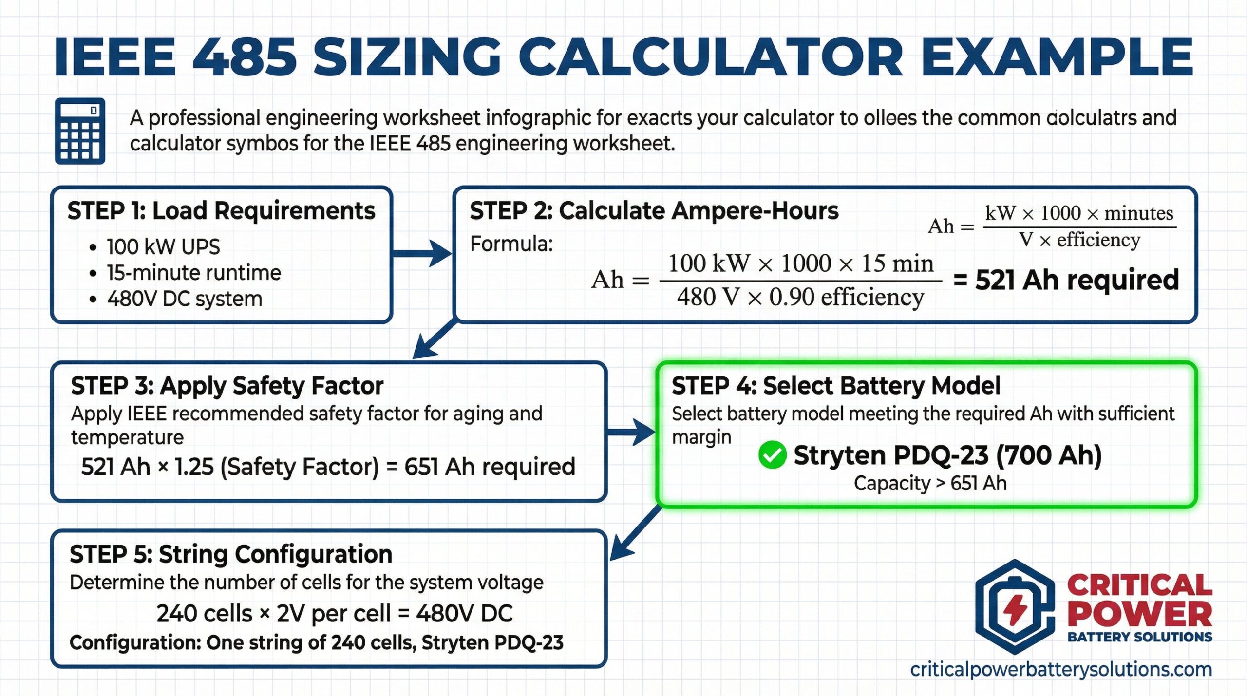 Use the IEEE formula: Capacity (Ah) = (Load Watts × Hours) / (Volts × Efficiency). For a precise calculation, efficiency is typically 0.8 (80%) for lead-acid batteries. Always apply an aging factor (1.25) to ensure the battery meets the load at the end of its life [2].